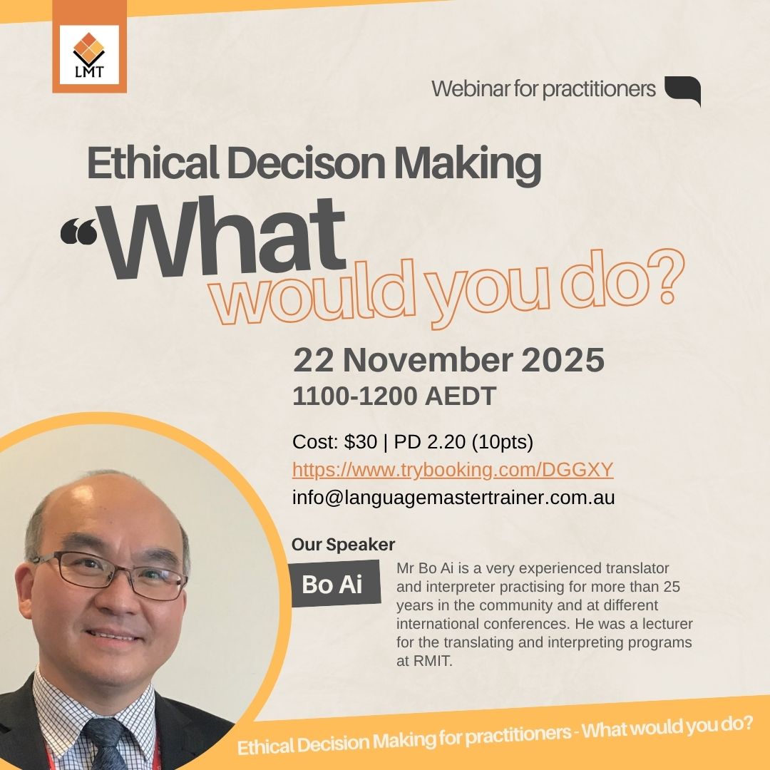 Webinar outline: Mr Bo AI, NAATI Accredited Professional Translator/Interpreter since 1997 guided us through some of the ethical challenges interpreters have to deal with during COVID.